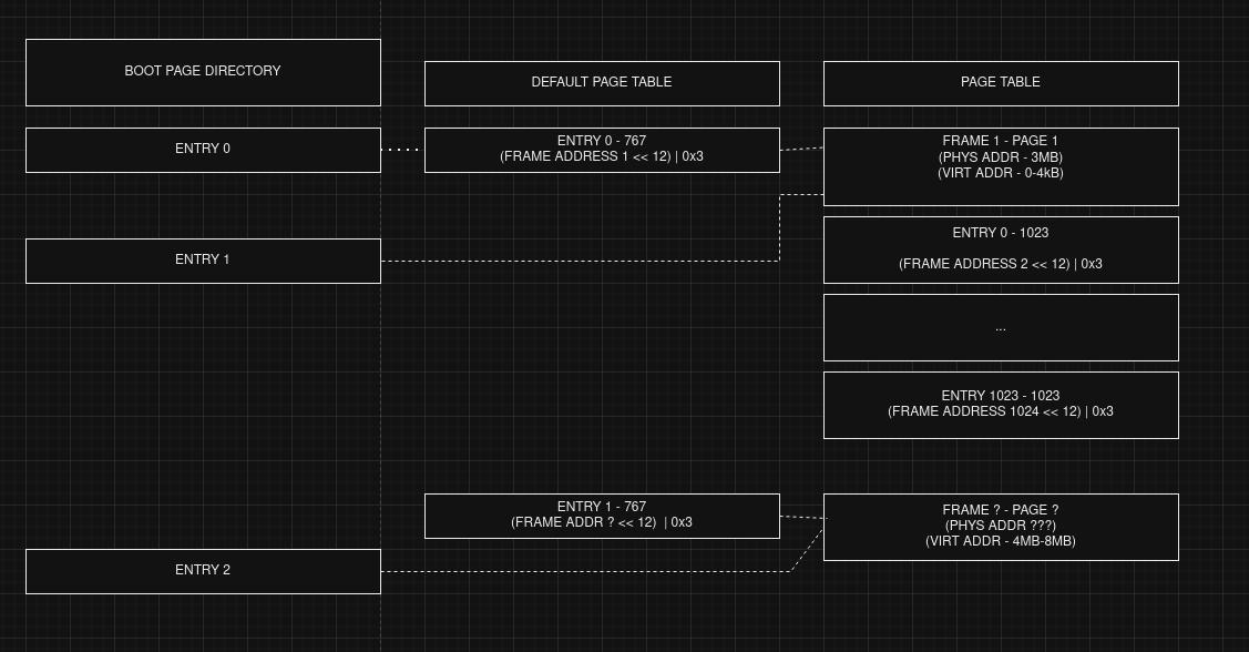 Cause create all pt will cost 3MB (768 * 1024 * 4, 768: cause is our heap limite, 1024: cause each pt contains 1024 entry and 4: cause size of pte is 4byte) we decided to create it on the heap and dynamically. So the first pt of the pd (pd[0]) will contain a default_page_table (or heap_pt). Each page create by each the heap_pt will be a pt added to the pd.